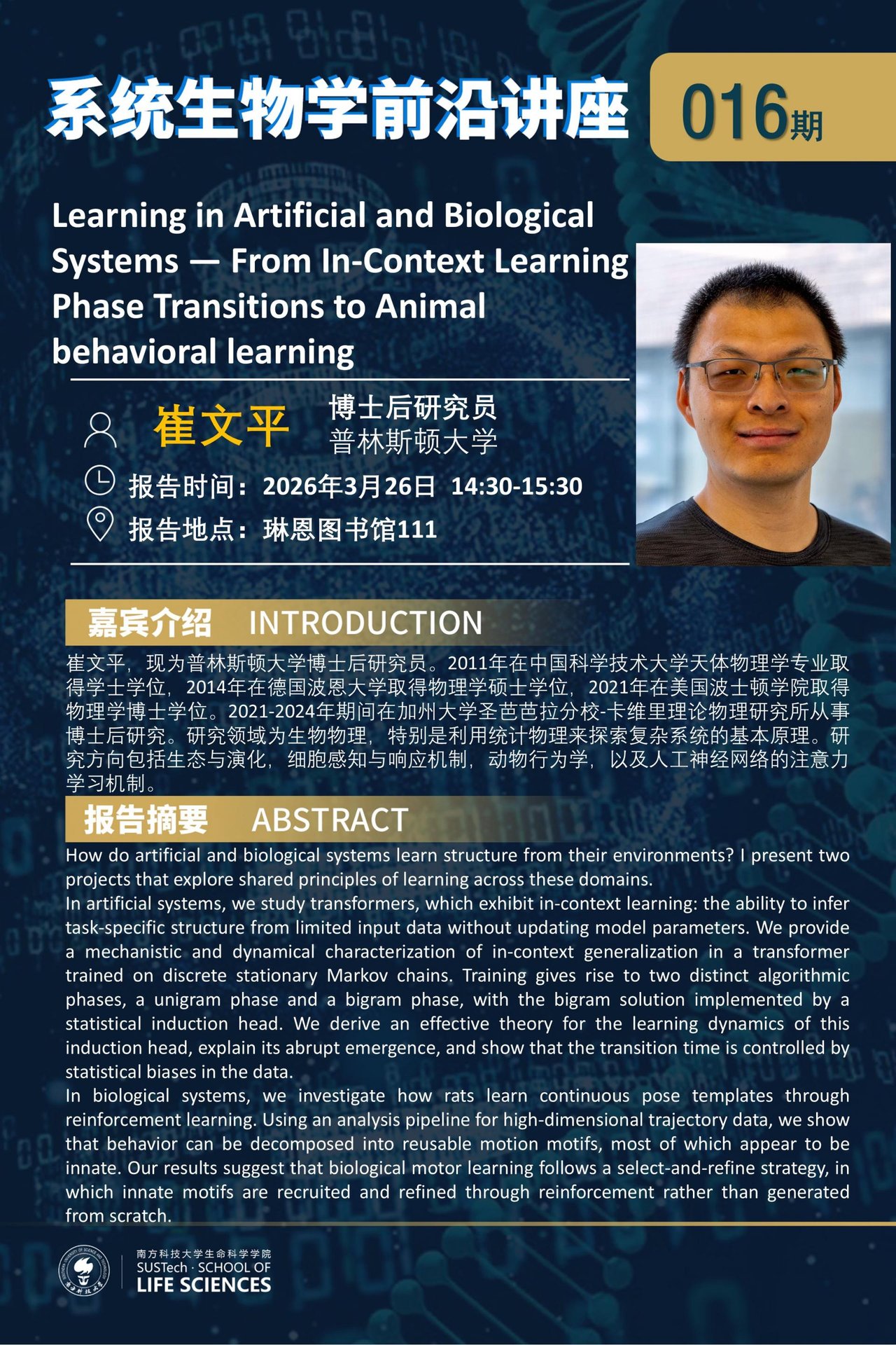 《系统生物学前沿讲座第16期》崔文平 博士后研究员:人工与生物系统中的学习——从上下文学习相变到动物行为学习
