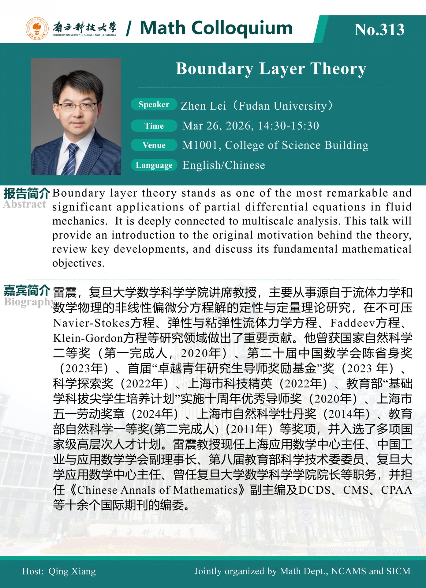 《Math Colloquium 第313期》雷震 讲席教授:边界层理论